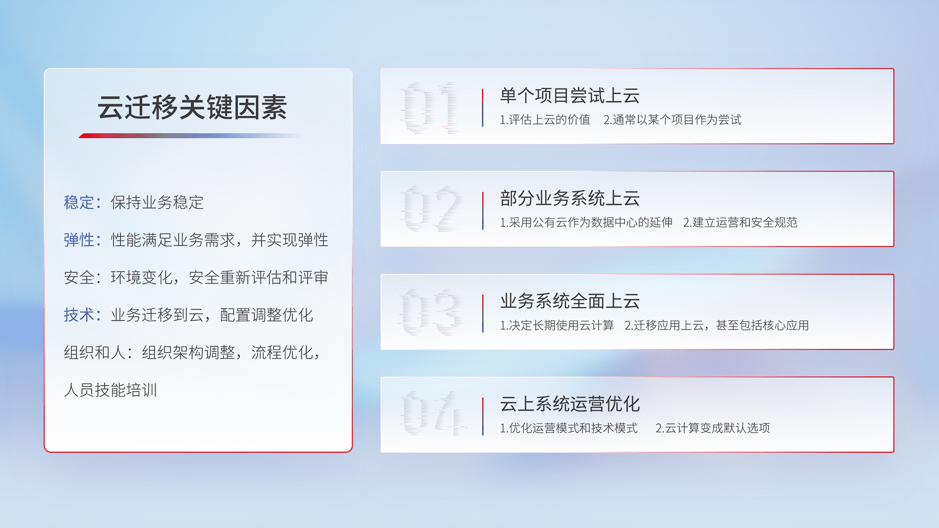 结合实际业务,,,,从规划设计、、、云平台选型、、、云原生改造、、、、数据迁移、、、集成交付,,,,迁移全过程为客户识别最佳上云路径,,,做好风险识别管理,,,,设计网络架构、、、、身份权限、、、、安全审计合规、、、操作审计、、日志审计、、监控告警策略、、、多站点容灾设计等,,,,对云上基础设施进行整体规划,,,提升IT治理水平,,,以满足弹性、、、、高可用、、、高性能的需求。。
