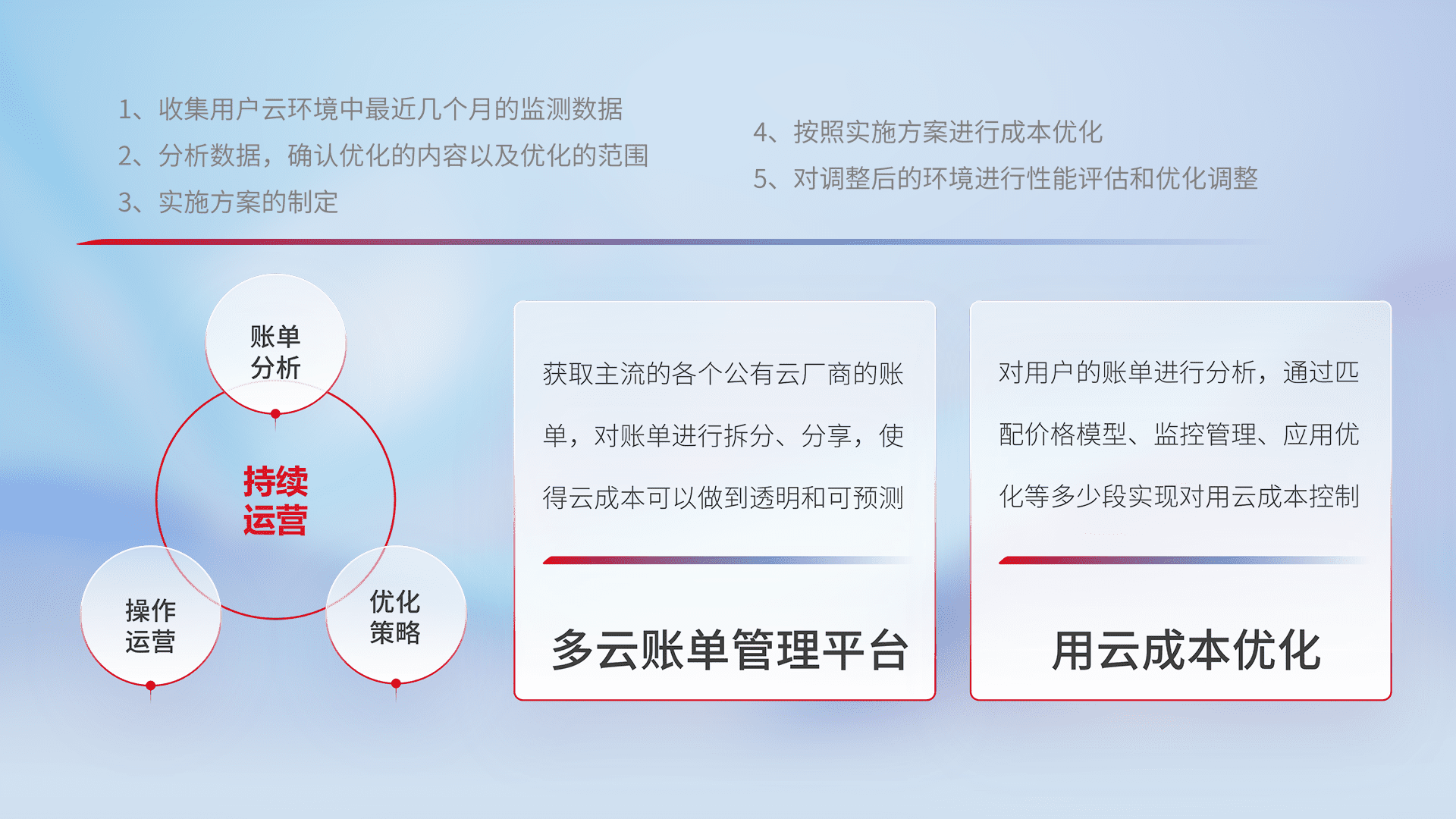 通过多云纳管,,以统一的资源数据模型把客户的云资源进行抽象和封装,,进而实现对多云资源的统一操作,,,,保障云资源管理的可靠性、、稳定性与可用性。。。。量身定制化运维内容,,配置、、、、开发运维、、、补丁管理、、、、备份、、、、监控、、、认证和访问管理、、审计和日常巡检等,,保障在用云过程中的可靠度,,稳定度以及高可用率。。。。